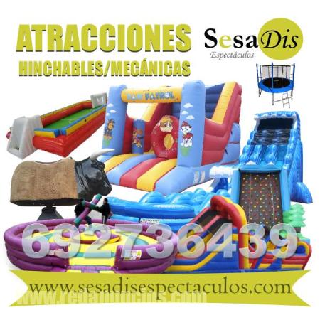En Sesadis Espectáculos somos especialistas en el alquiler de atracciones hinchables para todo tipo de fiestas, ferias y eventos. Ofrecemos una amplia variedad de castillos hinchables, toboganes, rocódromos, toro mecánico, futbolín humano, barredora, acuáticos, etc. para niños y adultos.