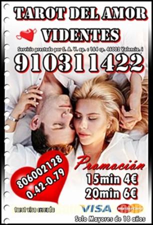 TAROT VISA CON TARIFA CERRADA /TAROT DEL AMOR /VIDENCIA 910311422 VISA desde 4€ 15 min/ 6€ 20min/ 8€ 30min//10€ 40min /15€ 55min / 17€ 70min/ 20€ 90min...806002128 desde Coste min. 0, 42/0, 79 cm € min red fija/móvil. Soy vidente profesional Fechas. Te garantizo una consulta de alta calidad, déjame decirte lo que vendrá a tu vida, con tan solo oír tu voz Alta experiencia en tarot del amor , de Pareja , Amistad , también en temas Laborales, Familiares, Económicos… videntes psíquicas expertas Servicio prestado por S.A.V. ap. c 164 cp. 46002 Valencia. Solo mayores de 18 años. Llamada a teléfono sin coste adicional. Visa 910 311 422 / 806 002 128 desde Coste min. 0, 42/0, 79 cm € min red fija/móvil. Videncia, Tarot, Tirada del Amor, rituales, péndulo, Numerología, Runas, sueños.