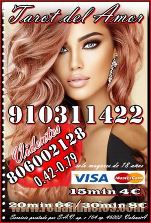 TAROT VISA CON TARIFA CERRADA /TAROT DEL AMOR /VIDENCIA 910311422 VISA desde 4€ 15 min/ 6€ 20min/ 8€ 30min//10€ 40min /15€ 55min / 17€ 70min/ 20€ 90min...806002128 desde Coste min. 0, 42/0, 79 cm € min red fija/móvil. Soy vidente profesional Fechas. Te garantizo una consulta de alta calidad, déjame decirte lo que vendrá a tu vida, con tan solo oír tu voz Alta experiencia en tarot del amor , de Pareja , Amistad , también en temas Laborales, Familiares, Económicos… videntes psíquicas expertas Servicio prestado por S.A.V. ap. c 164 cp. 46002 Valencia. Solo mayores de 18 años. Llamada a teléfono sin coste adicional. Visa 910 311 422 / 806 002 128 desde Coste min. 0, 42/0, 79 cm € min red fija/móvil. Videncia, Tarot, Tirada del Amor, rituales, péndulo, Numerología, Runas, sueños.