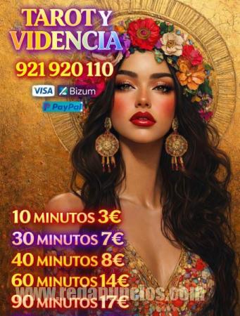 Servicio Profesional de Tarot y Videncia Ofrecemos consultas de tarot, videncia y clarividencia con tarotistas, videntes y médiums altamente especializados. Nuestro equipo cuenta con amplia experiencia en lectura de tarot y cartas, tarot de Marsella, consultas espirituales y psíquicas, predicciones sobre amor, trabajo y futuro, y guía espiritual personalizada. Teléfono: 921 920 110 Formas de pago: VISA, Bizum y PayPal Tarifas especiales: 10 minutos 3 € 30 minutos 7 € 40 minutos 8 € 60 minutos 14 € 90 minutos 17 € Ofrecemos tarot por teléfono, tarot online inmediato, consulta privada y confidencial, atención profesional y fiable, y un servicio económico y accesible. Si buscas una consulta de tarot profesional, una vidente experta o una lectura clara y sincera, estamos aquí para ayudarte. Descubre lo que el destino tiene preparado para ti con un servicio serio, directo y sin rodeos.